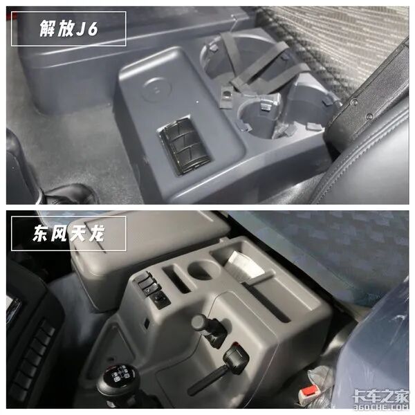 解放J6得益于对称式中控台的造型设计,使得其中央发动机鼓包位置还能保持一个比较宽阔且平整的平台,不过解放在此安装了一个大杯架与大储物箱,提升车内储物能力的同时,也丧失了车内灵活的走动空间。