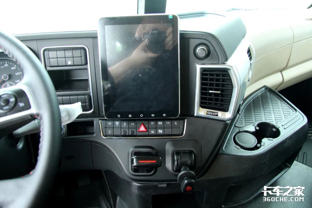 实拍车型还配备了360环绕影像,这对于我们需要经常进出货场以及狭窄区域的卡友来说,是一项福音,有了这项装备之后,在腾转挪移、转弯掉头时都可以更加便捷,有效减少车身周围的盲区面积。