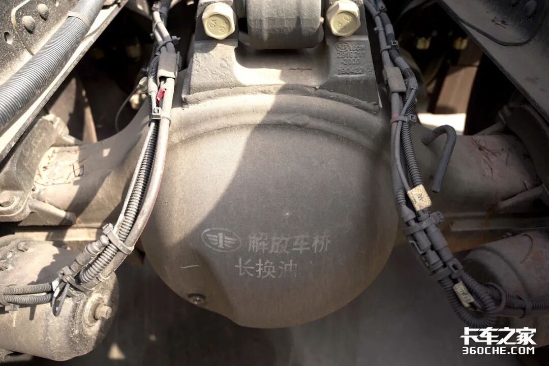 底盘部分,这款解放J6V选择的是速比为3.417的440冲焊桥(轮间差速锁),采用前2后3片板簧悬挂,