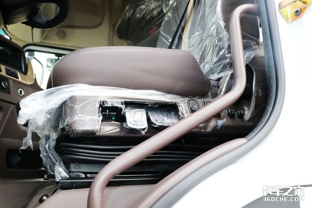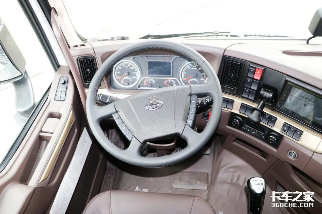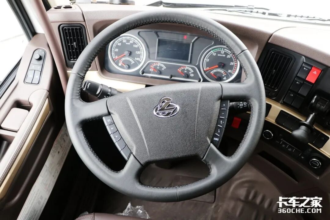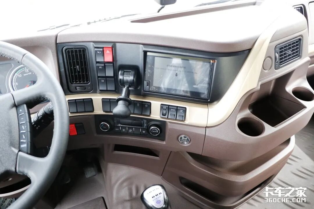 实拍车型的驾驶室同样采用了时下流行的半环抱式操作台,卡其色、香槟金以及黑色磨砂饰板共同营造了更加高级的驾驶室氛围。车窗采用电动升降,同时后视镜调节与加热功能也集成在门板前方,使用更加方便安全。
