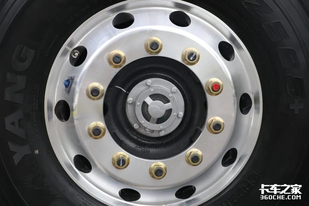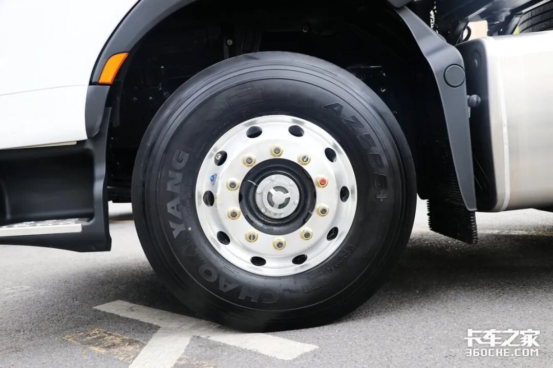 轮胎方面,实拍车型装配了10条AZ565+花纹的朝阳轮胎,规格为12R22.5,这款轮胎采用四条直线型花纹沟辅以窄横沟,具有优异的直线行驶性能和防湿滑性能,更适合在铺装路面行驶。从这一点上我们可以看出,这台车的定位是高速快线物流工况。