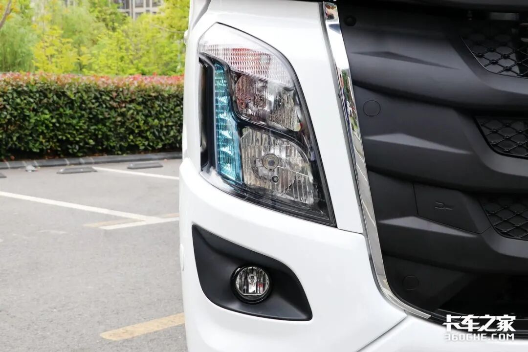 车辆大灯依旧是标准的乘龙经典设计,蓝色日间行车灯带很有辨识度,不过该款车型的大灯采用了熏黑灯罩,看上去更加具有进攻性,整体视觉效果还是很出色的。