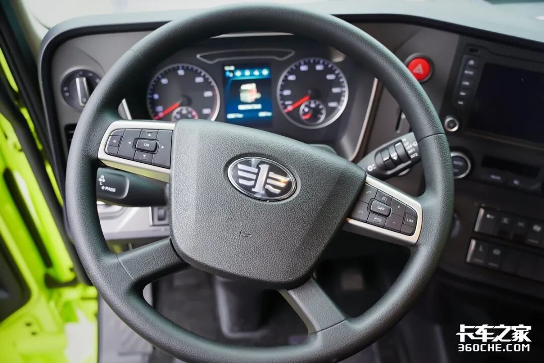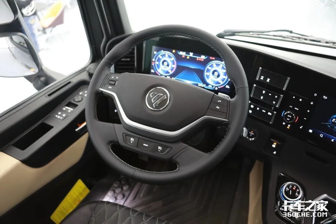 多功能方向盘在设计的细节上把控非常到位。首先它采用了即使在旗舰重卡中也比较少见的全皮质包裹,握感一流。还有,当按下气动按钮后,方向盘支持上下大角度调节,这个设计和斯堪尼亚的方向盘有异曲同工之妙。