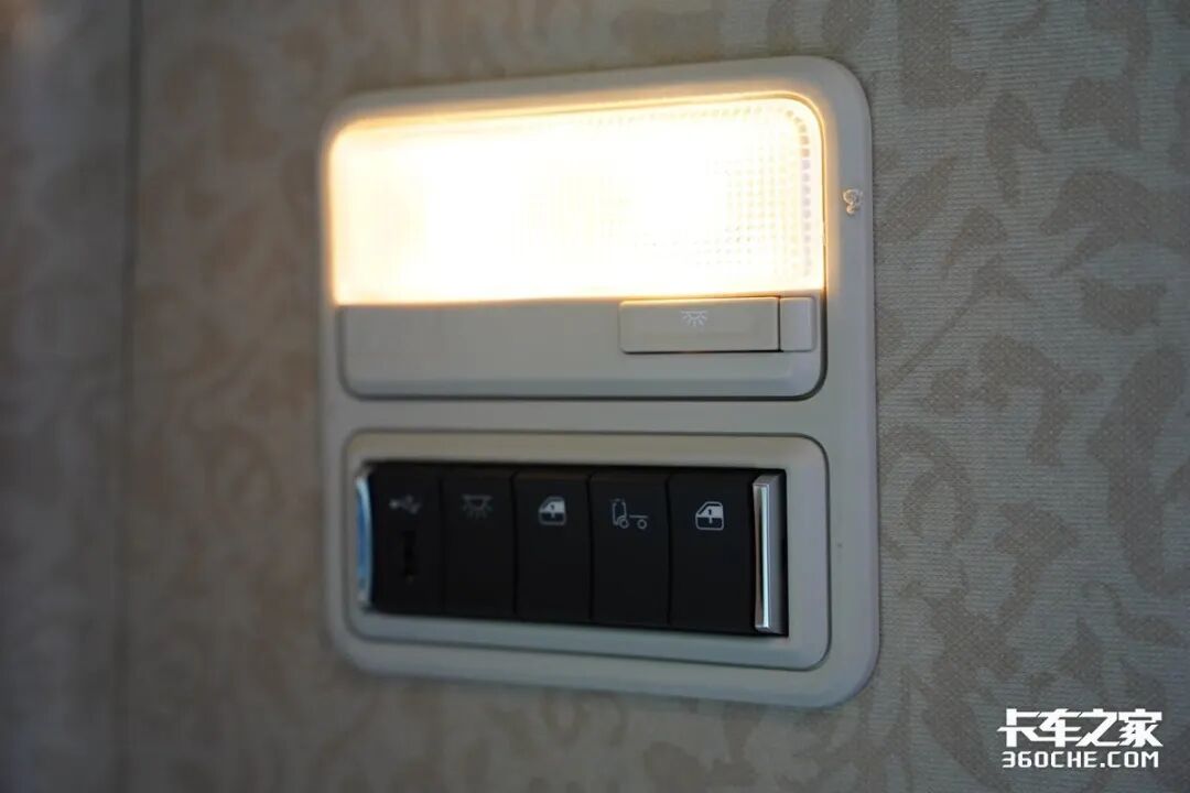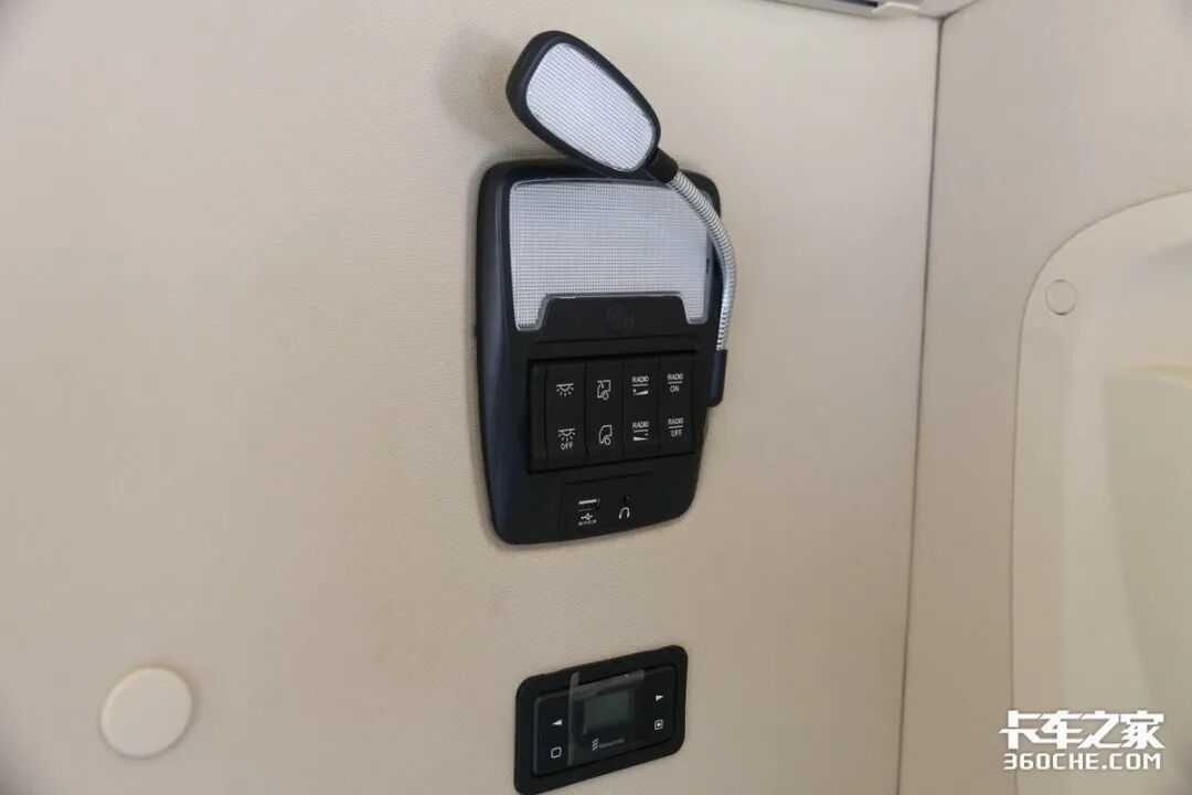 经过实测,卧铺的宽度为85厘米,在高端重卡中属于正常水平。下铺床头的位置有两层储物盒。功能性操作面板也放在了床头位置,其中包括耳机接口、音量调节、床头灯和USB接口。