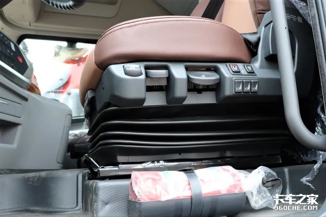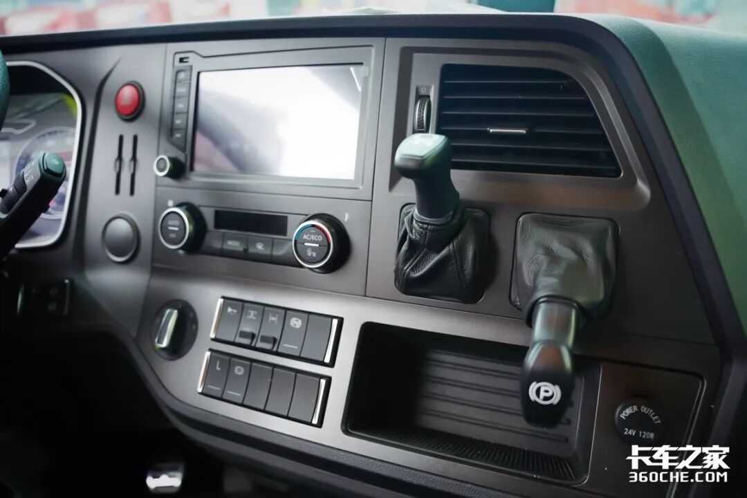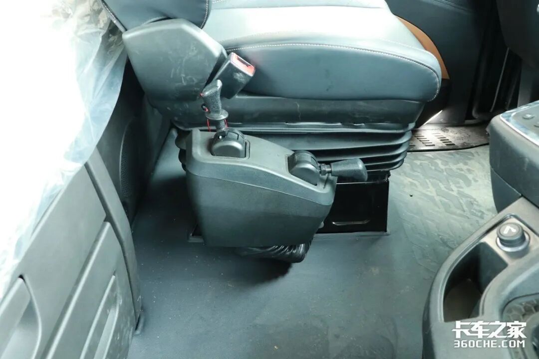 天龙旗舰同样采用了旋钮换挡机构,旋钮的位置被放在了座椅右侧,并随座椅前后、上下联动,这样在行车时随手便可操作。手刹和挂车刹车操作杆放在了座椅右侧,不随座椅联动。
