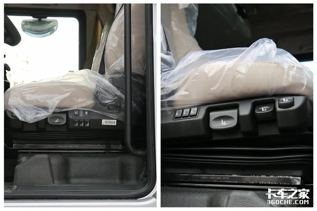 实拍车的主副驾座椅均采用了气囊减震结构,在功能上,都具有坐垫倾角调节、减震阻尼调节,腰部支撑和两级背部支撑。不过主驾座椅要更加豪华一些,配置有座椅通风加热功能。这些配置保障了主驾和副驾的驾乘舒适性。