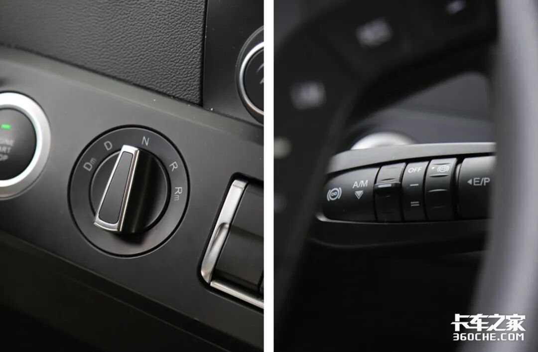 旋钮换挡机构的位置被放在了中控台的左下侧,最靠近驾驶位的区域,在旋钮位置的选择上,与解放J7相同。手动干预加减档的机构被集成在了方向盘右侧的怀挡中,液缓的开关也继承在上面,操作一体化程度高。
