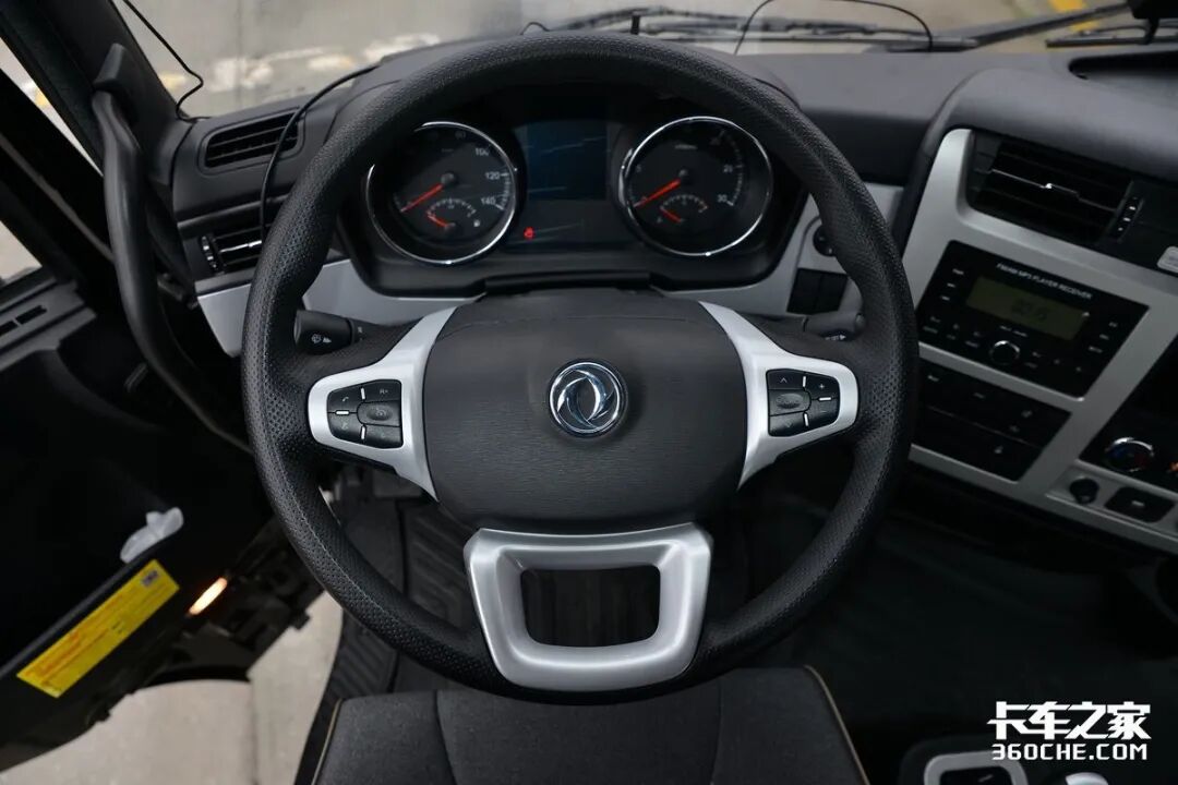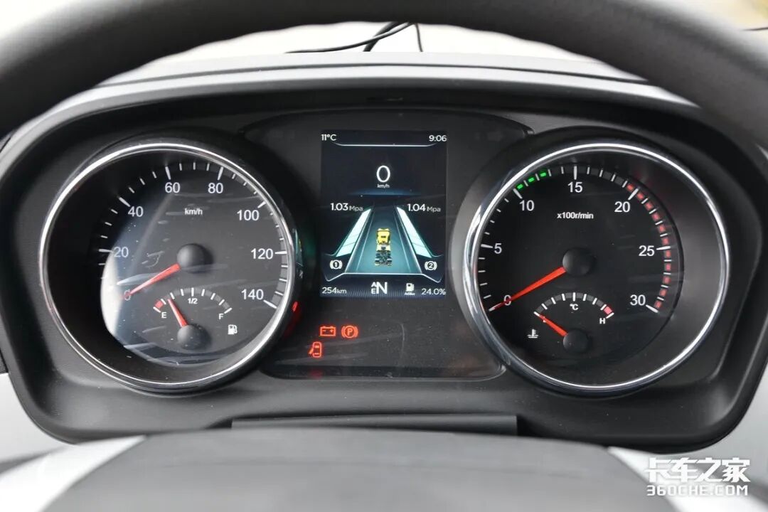 仪表盘采用了炮筒式设计结构,左侧为车速表、右侧为转速表,中间小型的液晶屏可以显示当前挡位、气刹储气量、续航里程以及尿素容量,行车信息比较全面。