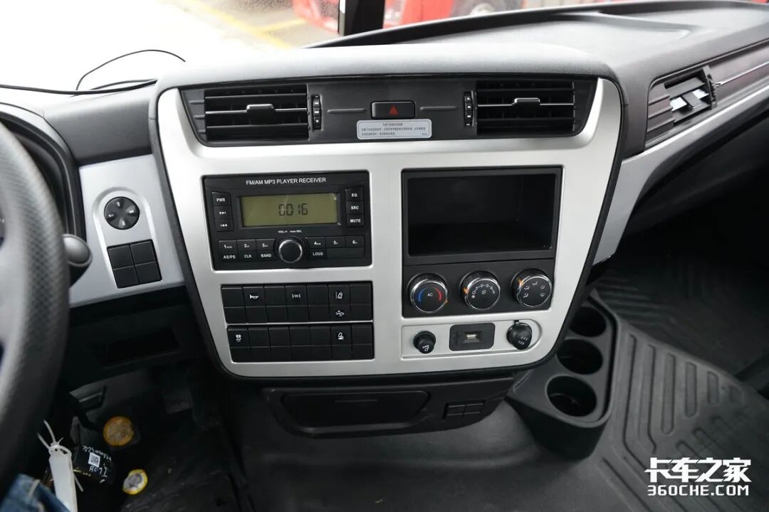 中控区域朝向驾驶员一侧,可以选装中控大屏设计,原厂提供了收音机、手动空调以及点烟器和USB充电接口,可以满足卡友日常的使用需求。中控台上方布局了两个大尺寸的储物台,不影响视线的情况下,可以放置一些杂物。