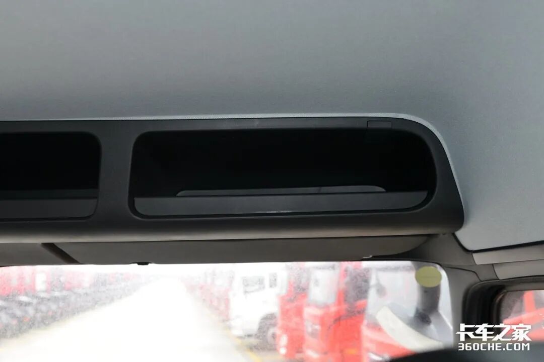 由于采用的了低顶驾驶室的设计,车顶上方选择了三个小尺寸的储物格,可以放置一些随身衣物。由于KL采用了近平地板驾驶室,车辆的内部高度依旧达到了180cm左右,身高过高的卡友在车内需要低头移动。