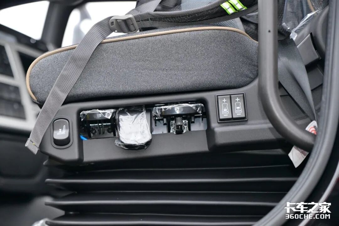 天龙KL采用气囊减震座椅设计,并且表面采用了织物材质,兼顾保暖、透气效果。同时座椅支持一键充放气,高低前后调节,并且还支持背部以及腰部支撑的调节,可适应各种身材的卡友。