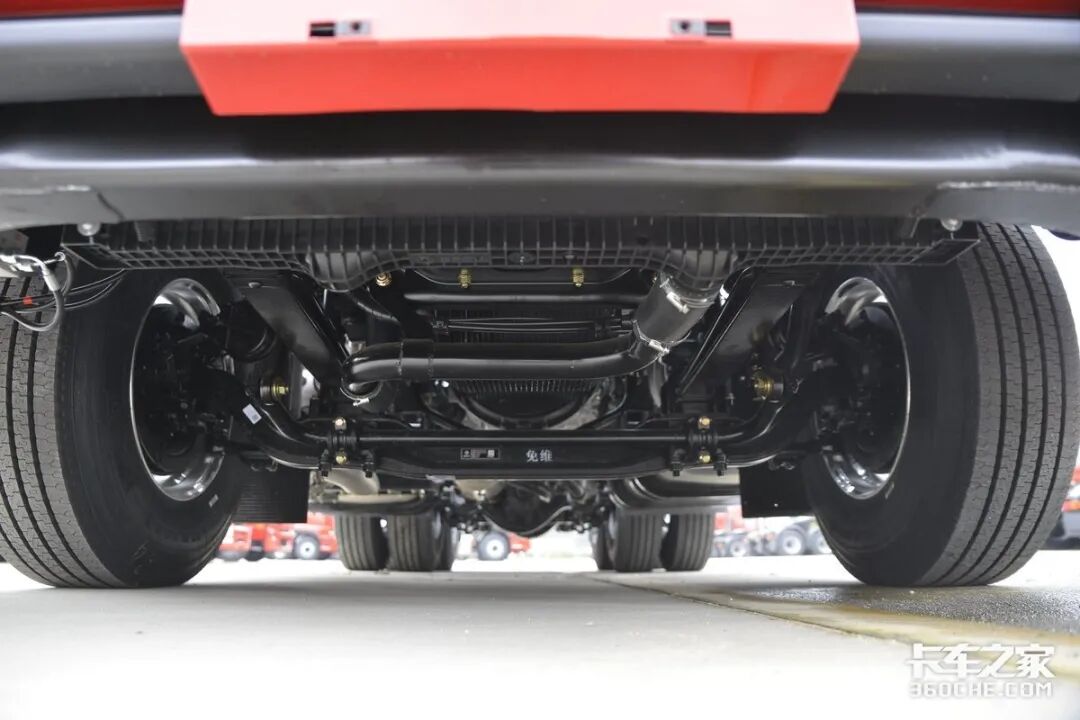 底盘方面,该车型采用并装双轴的新方盛车桥,2×440康迈后桥,速比为2.643。油箱是采用铝合金材质,车辆左右两侧分别为800L和500L,总容积到达了1300L。而轮胎是装配12R22.5型号的朝阳牌轮胎,全车标配了全铝合金轮圈。