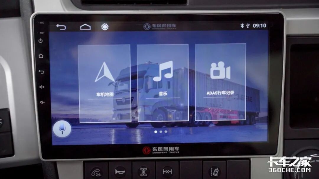 中控台设计比较简单,延续了东风天龙“简约实用”的风范,天龙KL标配MP5显示屏,支持语音控制、手机互联、音乐、行车记录仪、货车版导航、蓝牙等多种功能,最重要的设计有四路高清摄像头,还带有夜视功能,可以最大程度减少视觉盲区,提升行车安全性。