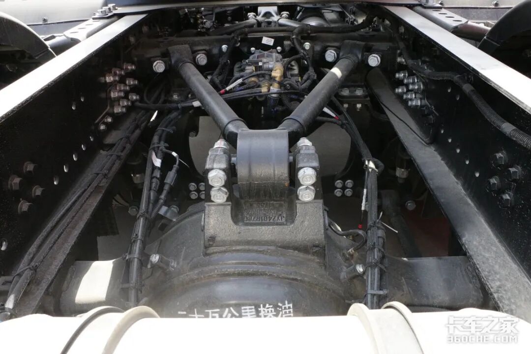 底盘方面,这款超越Q7的前桥采用锻钢件、工字型断面;后桥为单级减速桥,2.846速比。悬架形式为前2后3钢板悬架形式,实拍车型未配置空气悬架,不过可以选配,从事过干线物流的老司机都知道,配置空气悬架的好处有很多,如整车自重轻、能快速完成甩挂操作,提高运输效率。