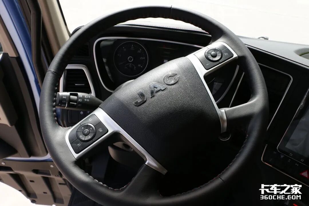 在后视镜设计上,还是依照市面上比较流行的一体式设计,标配有后视镜电动调节及电加热功能,雨雪天气行车更安全。还有大灯组,其造型倾向于江淮重卡A系产品,集成有远光灯、近光灯、转向灯及LED日间行车灯,雾灯设计在大灯组下方。