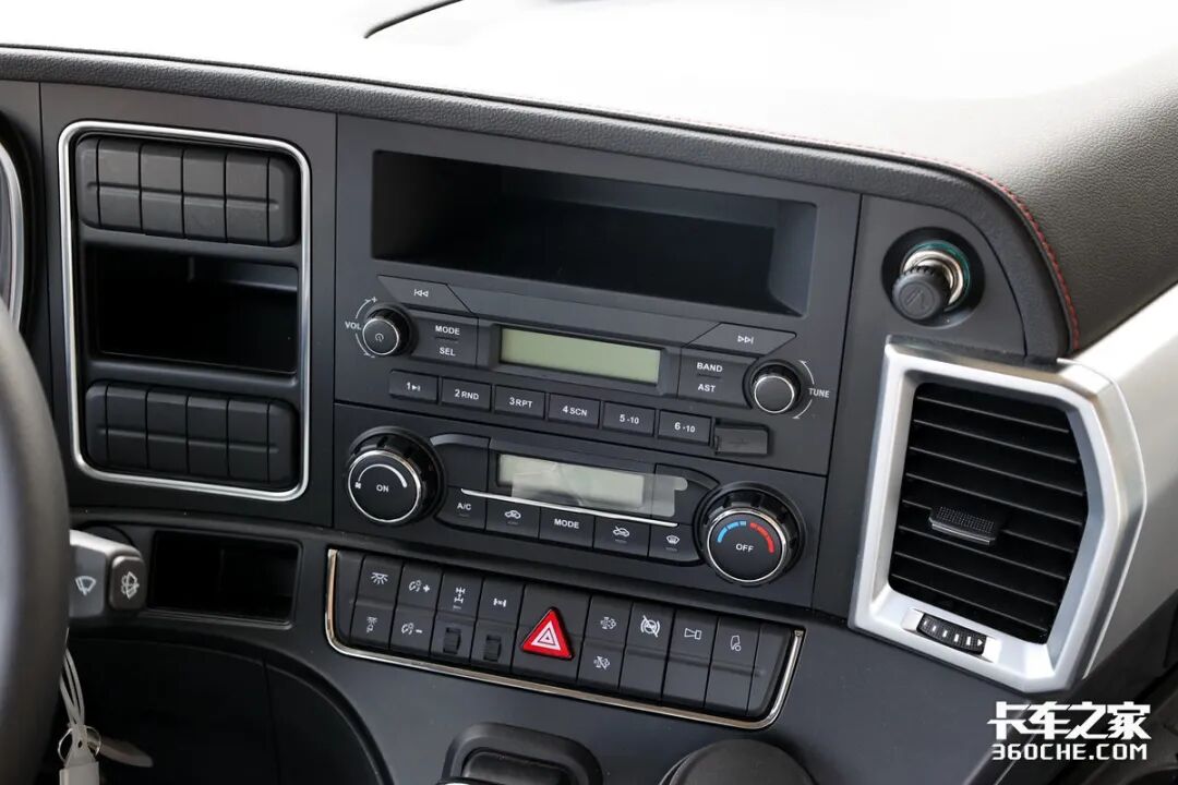 中控区域的设计相对比较简洁,大量的实体按键布局在上方,并且尺寸较大,即便是一边开车一边盲操作的可以得心应手。同时挂车刹以及水杯架均设计在这一区域,方便卡友操作。