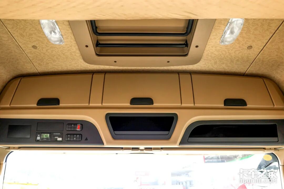 车顶共布局了三个带有盖板的高架箱,以及两个开放式的储物格,内部均采用了防滑材质处理,避免车辆在颠簸时导致车内异响较多。同时顶部原厂配有天窗设计,方便卡友后期加装驻车空调等舒适性配置。