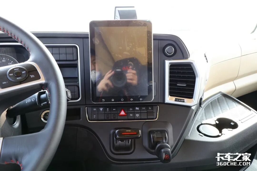 中控操作区域为半环绕式设计,主车和挂车制动阀都集成在了该区域。最令人瞩目的还是那块超大的多媒体液晶屏,卡友可选装10.4寸大屏,如同IPAD一样布置在中控台上,支持导航、影音娱乐、倒车影像等丰富的实用功能。