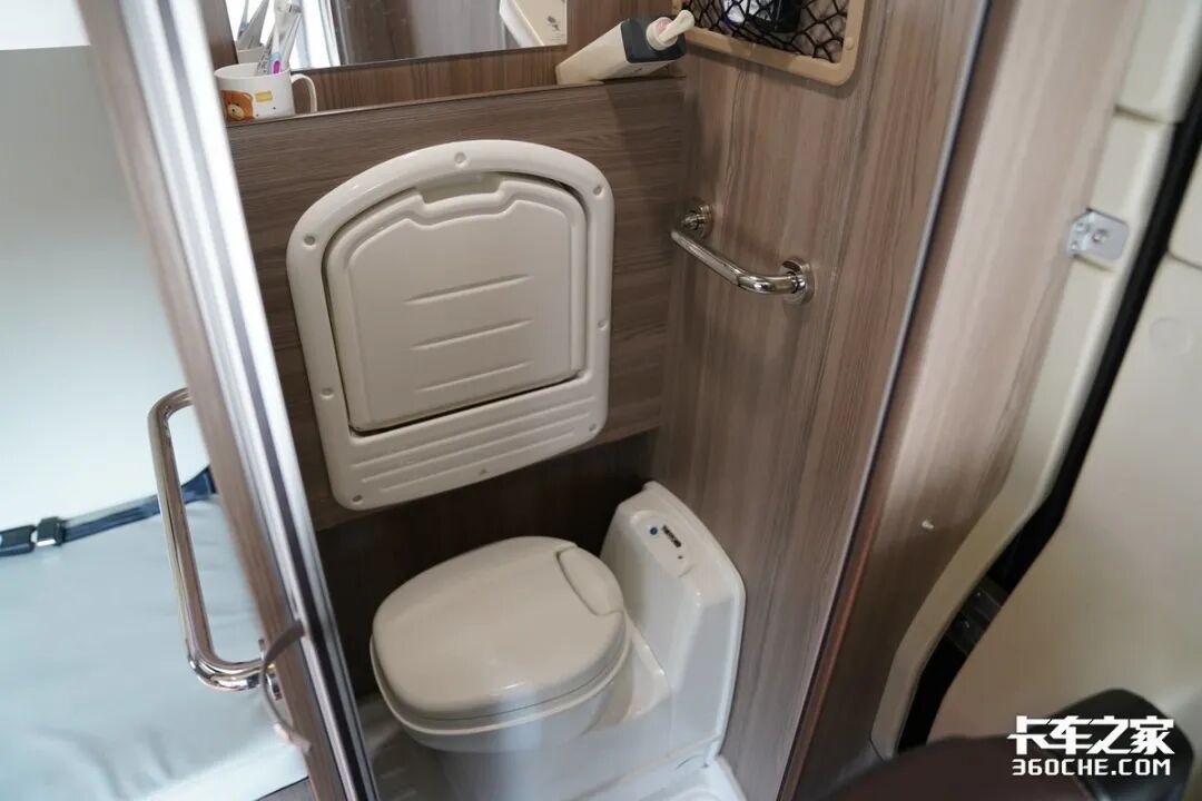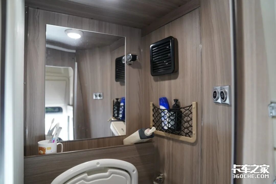 在下卧铺的右侧,是生活舱的独立卫浴,往上方看,梳妆镜、洗漱用品储物台、网兜、通风口一应俱全。独立卫浴的下方是经过独特设计的,“上半部分整体可旋转”的马桶,使用起来会更加方便。