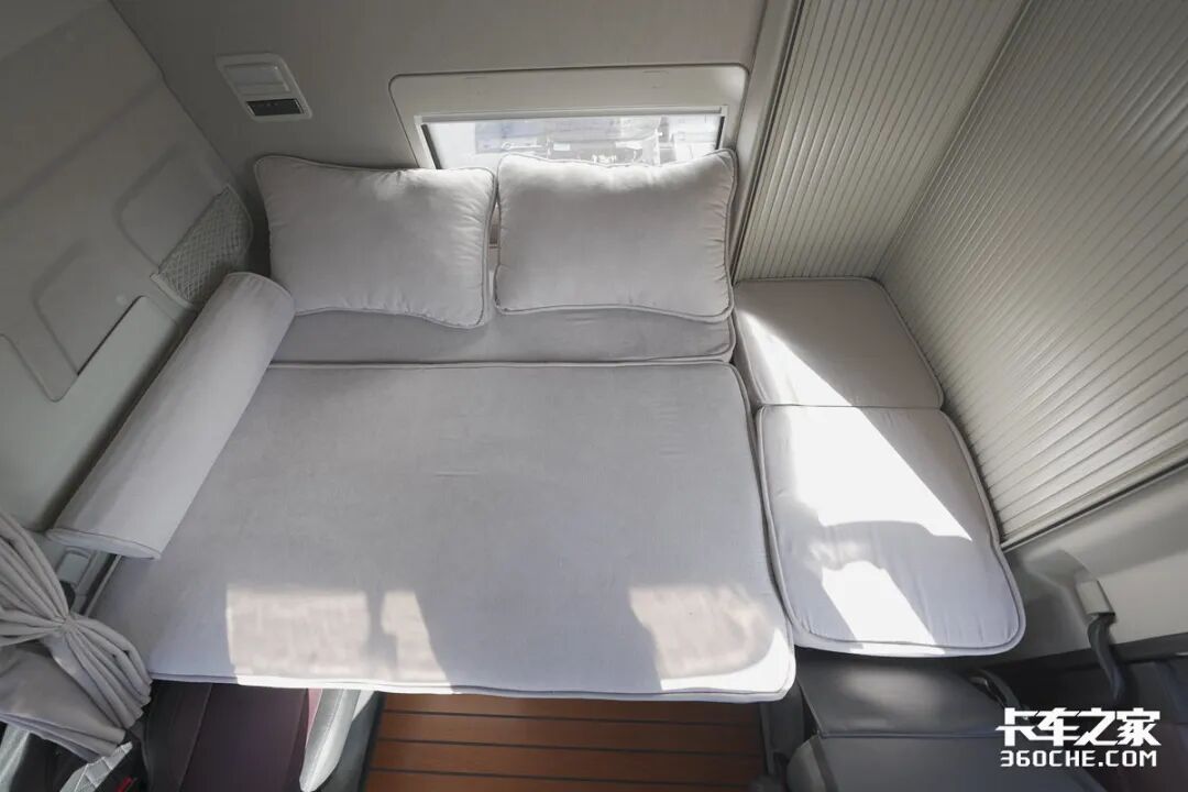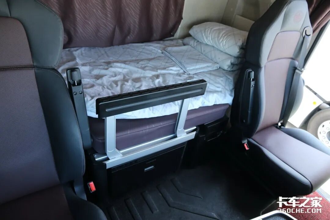 向驾驶室后方的休息空间看去,在现在的状态下,茶几和“沙发”组成了一个敞亮的“客厅”。在日常等待装卸货,短暂休息时,可以在这里喝茶、吃饭,而且就算再邀请一个人玩“斗地主”,空间也是绰绰有余。