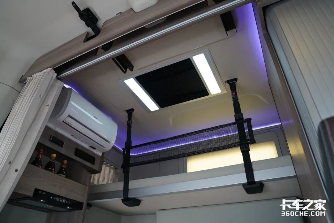 为了让驾驶室内部7.5平米的空间更加快速的变得凉爽起来,生活舱的独立厨房上方,配置了更大功率的独立空调挂机,制冷、制热更加迅速,提高我们的休息质量。