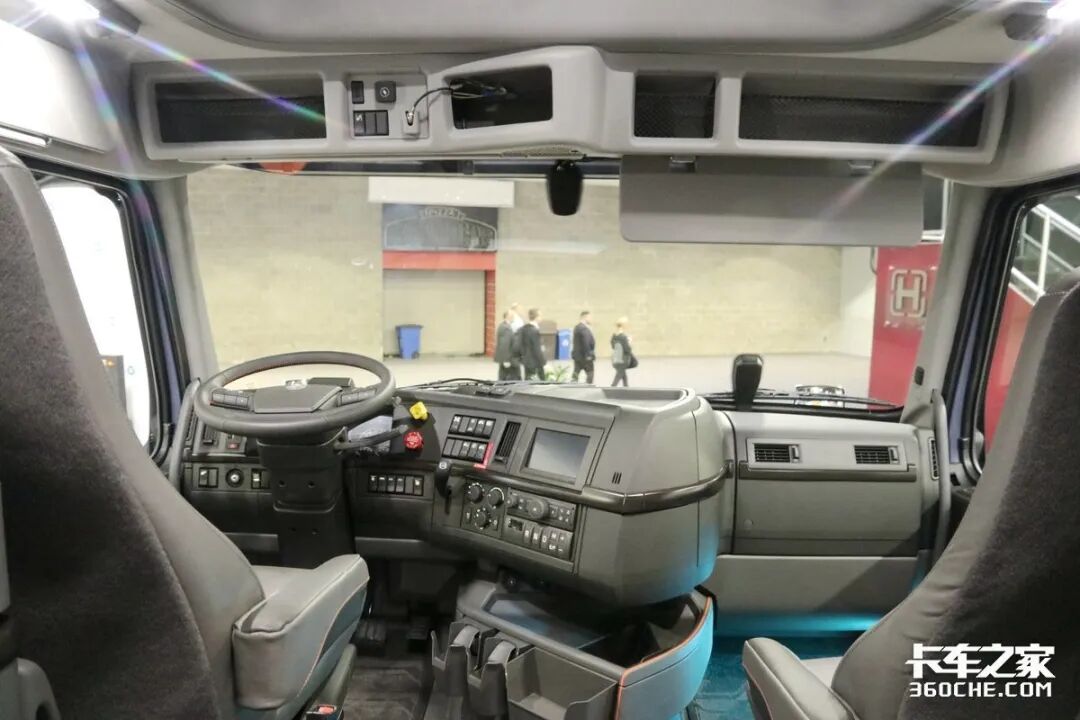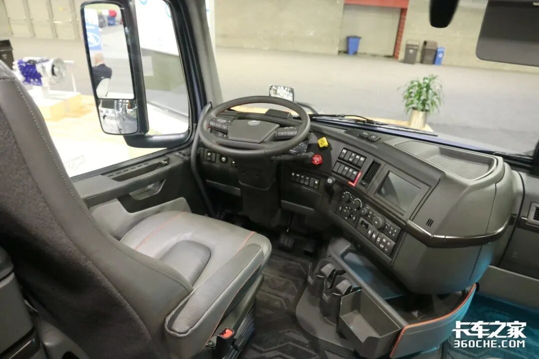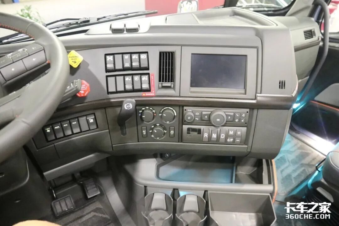 同样,变速箱可选的范围也比较大,可根据不同运输工况的需求选择沃尔沃i-Shift变速箱(12、13、14挡),伊顿(9、10、13、18挡)手动变速箱以及伊顿AMT(10、13、18挡)变速箱。而且变速箱操作机构选用的是按键式,集成在中控台上,可以释放驾驶室内地板上的空间,在国内重卡中目前还没有出现这样的设计。