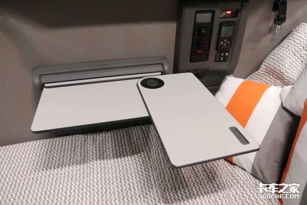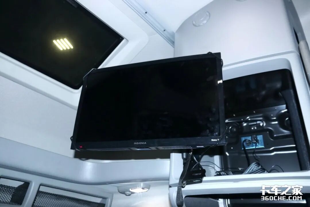 此外,这款沃尔沃长头车VNL760还带有车载电视,停车休息时打开电视,准备好美食,打开卧铺旁自带的小桌板,边吃边看,想想就觉得好爽!