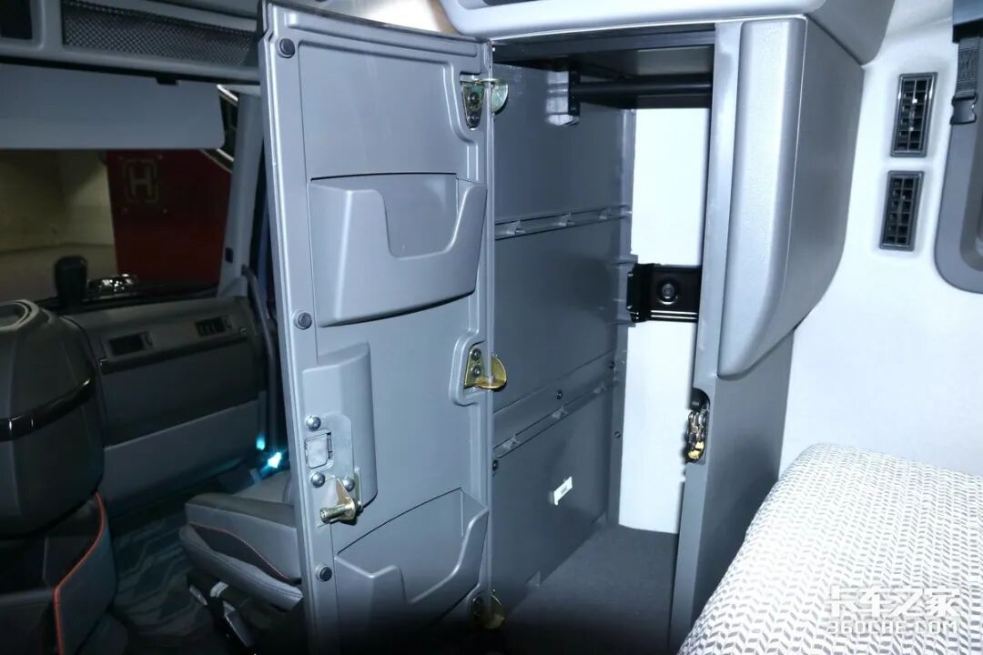卧铺旁边上方设计了微波炉,下方设计了车载冰箱,这些都是长途运输的必需品,和冰箱相对应的另外一侧,设计的是储物衣柜,细心的卡友可能会发现衣柜侧方设计有出风口,这款车自带驻车空调和驻车暖风,出风口分布在驾驶室多处,制冷更均匀。