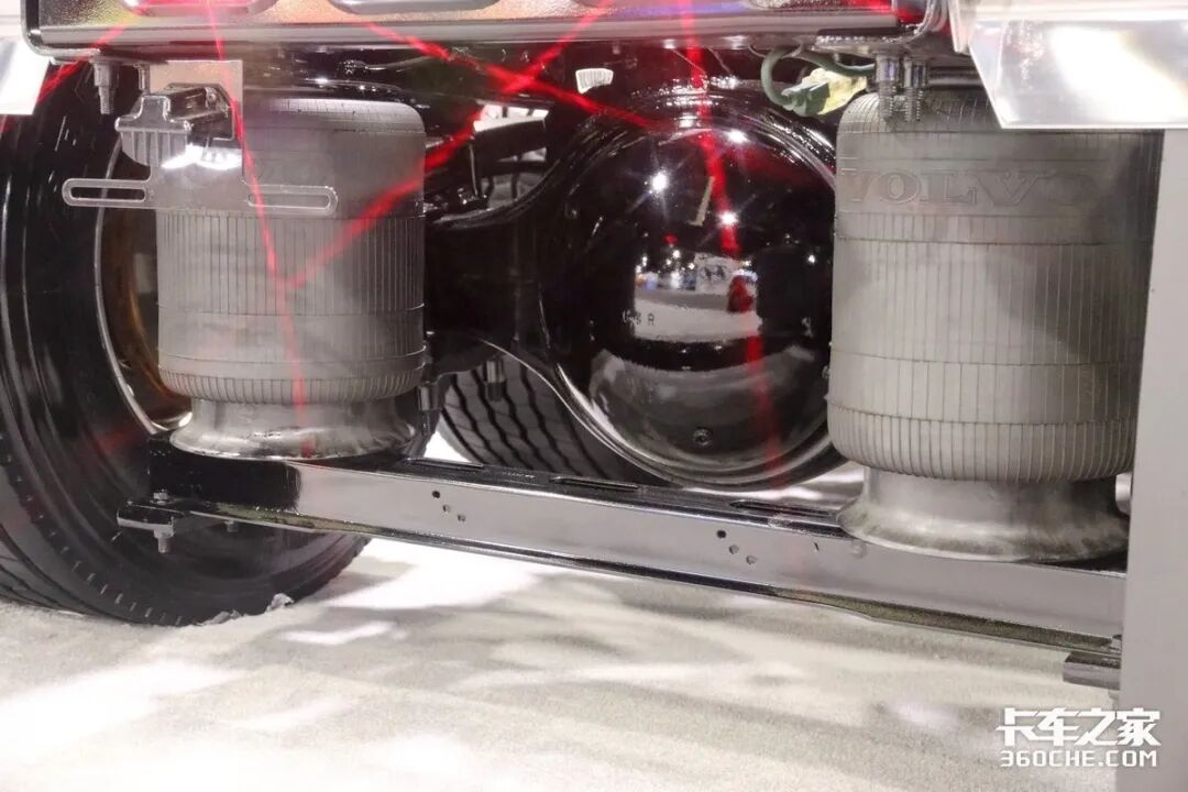 另外一点和国产重卡也有所不同,这款沃尔沃VNL760长头重卡后桥采用的是大单胎设计,尺寸为445/50 R22.5,相比国产车中常见的12R22.5轮胎,胎面更宽,但是单胎设计重量更轻,行驶的阻力也更小,并且整车都采用的是亮闪闪的铝合金轮辋。