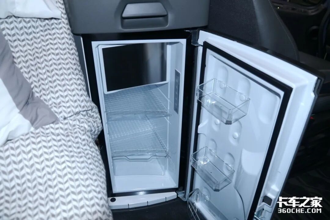 其实车载冰箱在国内重卡中选配的也比较多,只不过尺寸相对小一些,这一点主要是因为法规不同,毕竟国产长头车有长度限制,为了不影响后方装货空间,驾驶室的尺寸只能受限。