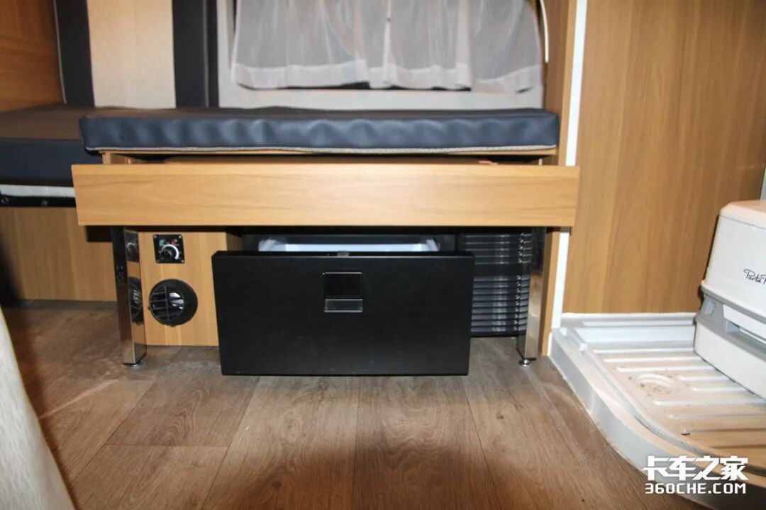 我们再来说说“不常规的操作”,解放鹰途底盘也采用的是仿木质设计,很有家的氛围。如果说前方是驾驶工作区,后半部分就是生活区,这不就是“一室一厅一卫”嘛!双卧铺设计,下卧铺厚度目测很厚,躺在上面翻滚应该会很舒适。