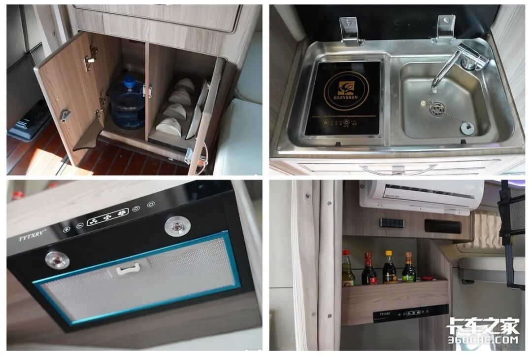 乘龙T7房车相比较鹰途而言,配备了一室一厅一卫,厨房部分相对比较简单,但是依然包含了设计师的小巧思,可折叠的电磁炉,做完饭之后也可以当做餐桌来使用,想象一下,披星戴月终于卸完货,和卡嫂一起坐在小桌旁吃饭,即使漂泊在路上也能感受到家的温暖。