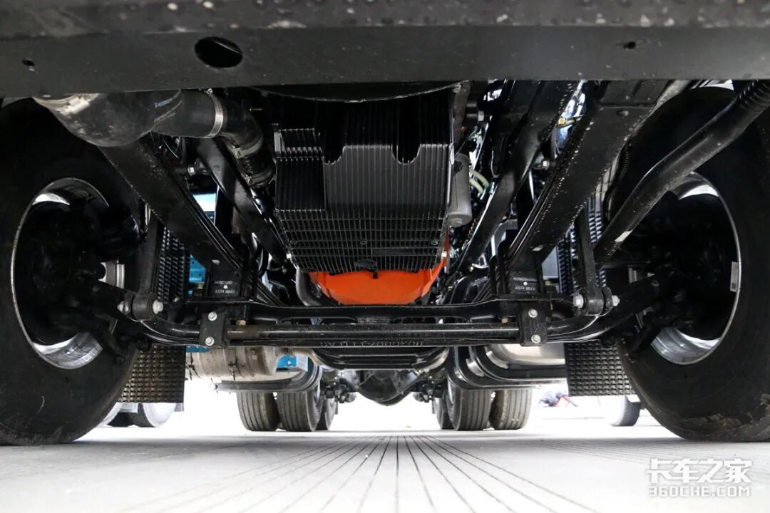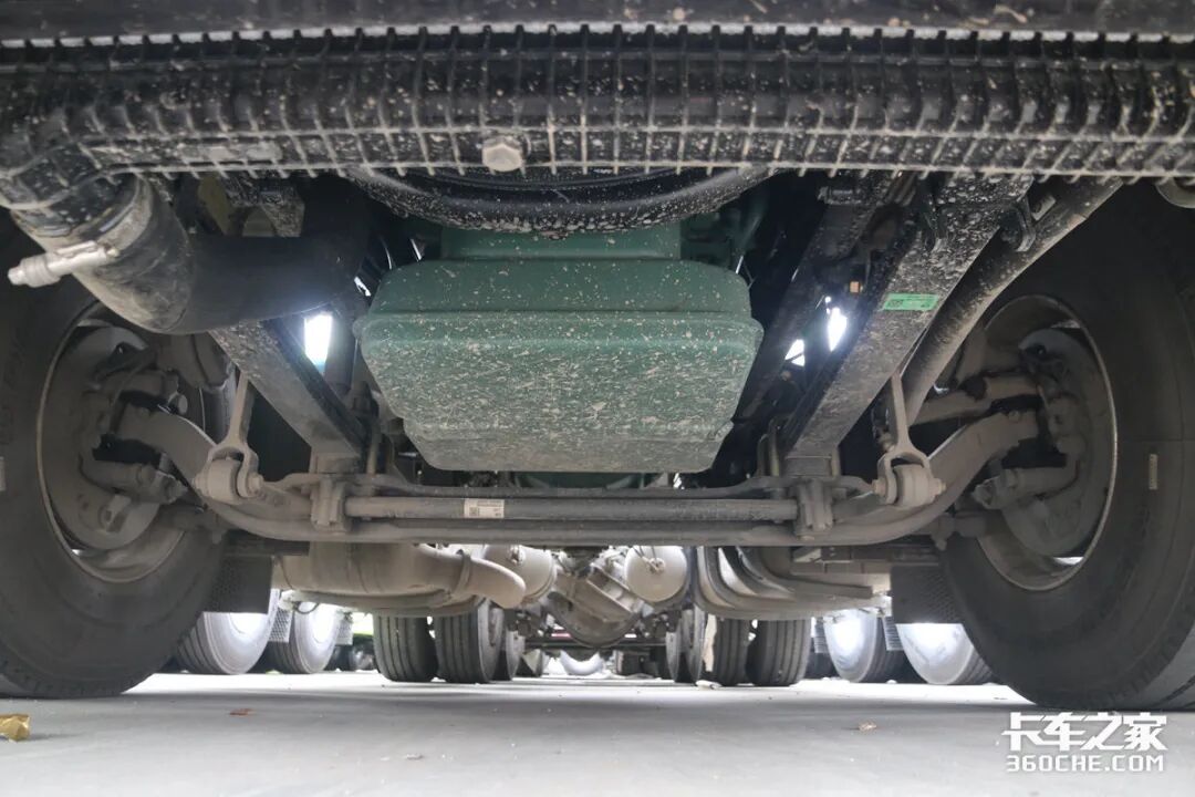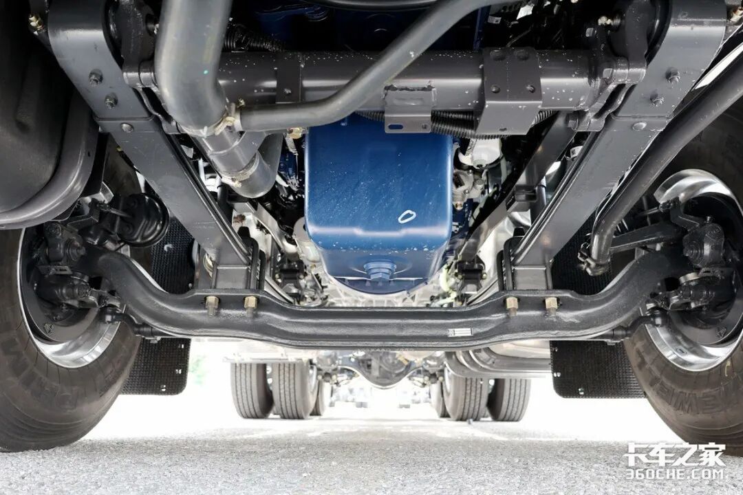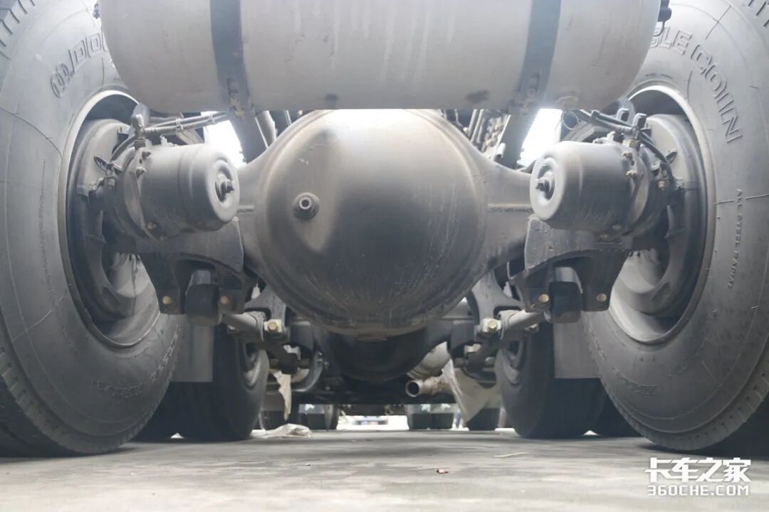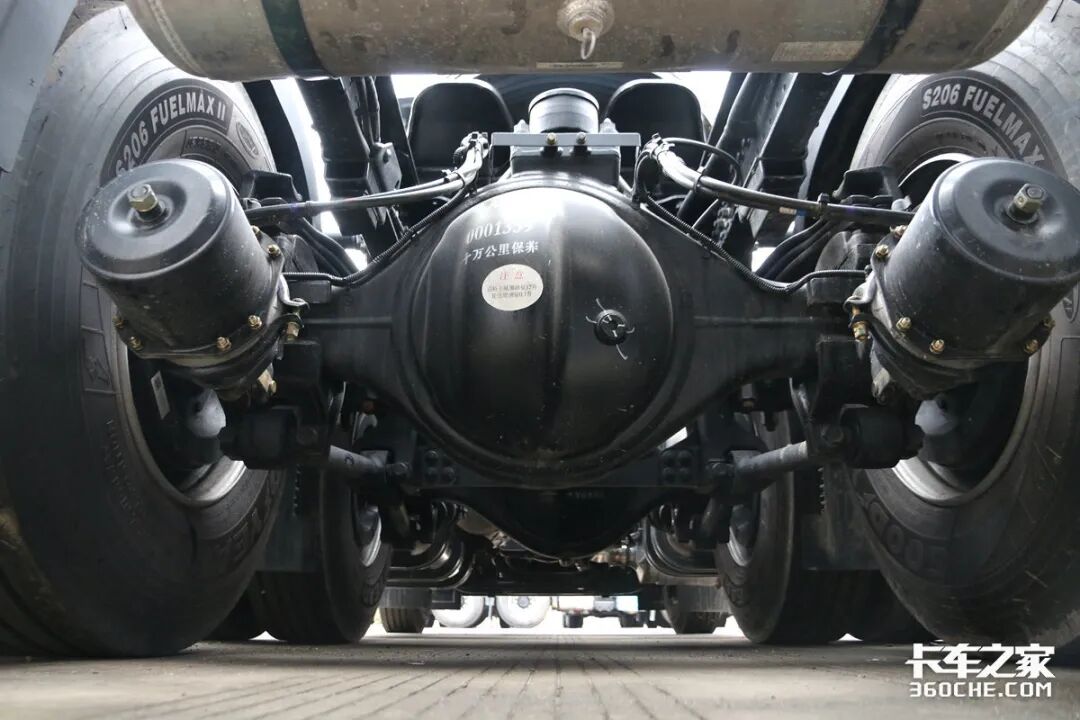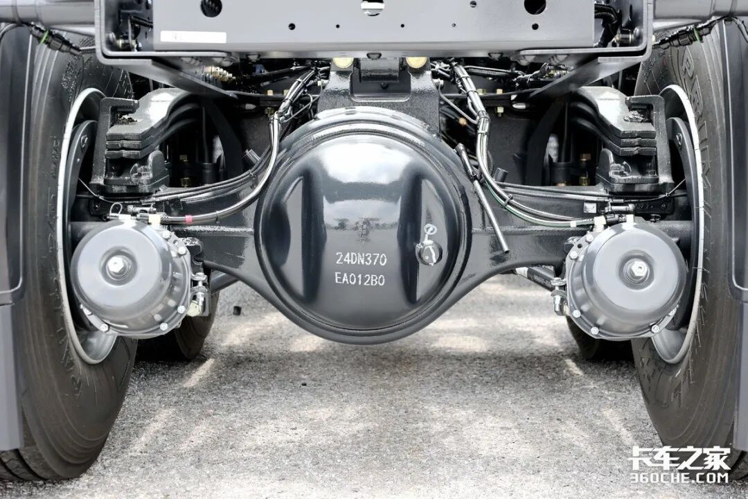 底盘部分,实拍车型采用前后钢板悬架,后桥则是来自解放自主研发的新440后桥,这款后桥重量更轻、传动效率更高,提供多种速比可选,如果你参与高速干线运输可以选择2.68速比,如果是平原丘陵地区则可以使用3.41的速比,而在山区工况下还提供3.72的速比,选择面很广。