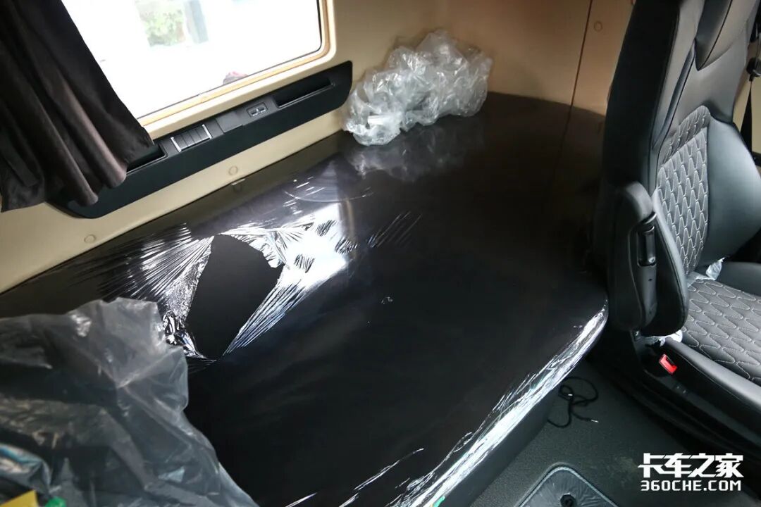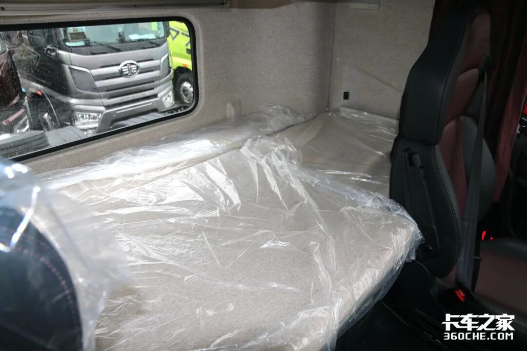 内饰采用了全新的设计语言,大面积的皮质、搪塑工艺的软质材料运用,让J6V看上去非常出众,由于采用了平地板驾驶室的设计,配合旋钮式AMT变速箱,可以让J6V拥有足够宽敞的中央通道,方便左右挪动或者进出卧铺区域。