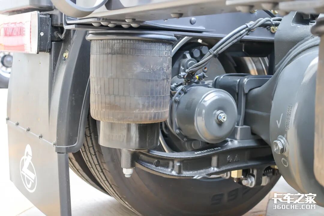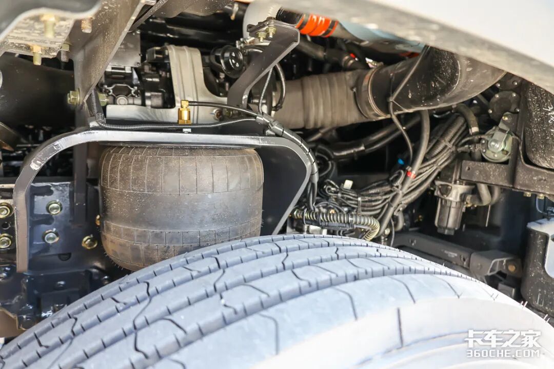 整车配备了10个气囊,前轴两个,中后轴8个。一方面可以方便调整车辆底盘高度,进行快速甩挂作业,提升运输效率。另一方面,气囊悬挂能够减低车身的自重,提高舒适度和平稳性,在运输易碎货物、精密仪器、危险品等高附加值货物时优势较大。