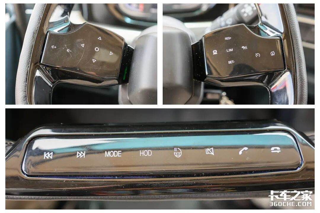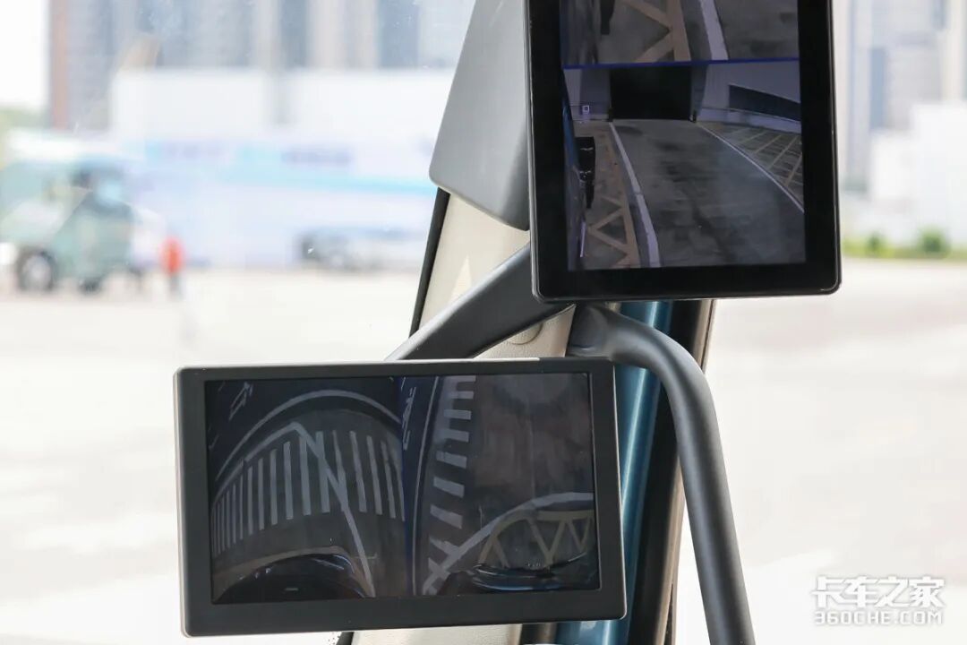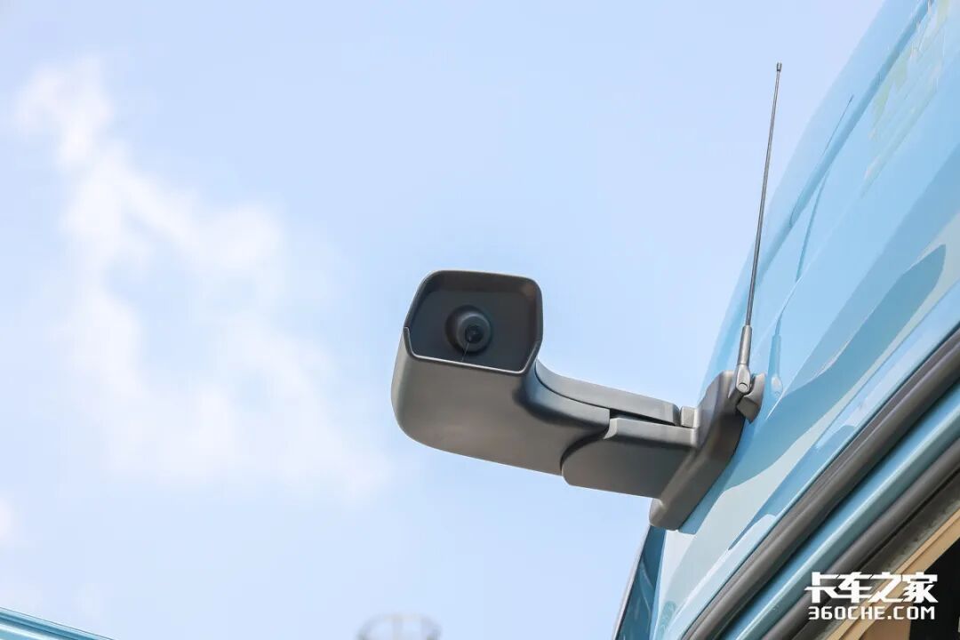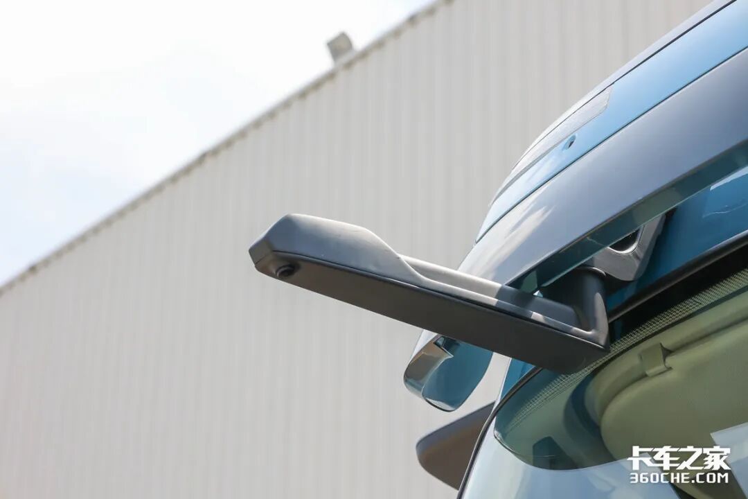 再往上看,咦,驾驶室怎么少了两只“耳朵”?没错,H7智控牵引车取消了传统后视镜结构,采用的是电子外后视镜,跟去年的车型是如出一辙的。并且外探的距离更大,同时摄像头部分还支持电动折叠,停车时不容易被剐蹭。