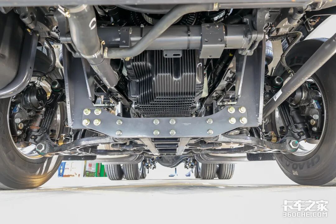 驱动桥方面,实拍车辆采用了两条东风德纳新440后桥,主减速比为3.417。为了防止在不平路面行驶引起车桥移位,该车使用了“X”型推力杆,并且驱动桥上设置了两个横销,能更好地保持中后桥的平衡,使车轮具有较好的附着力,从而提高行驶通过性与稳定性。