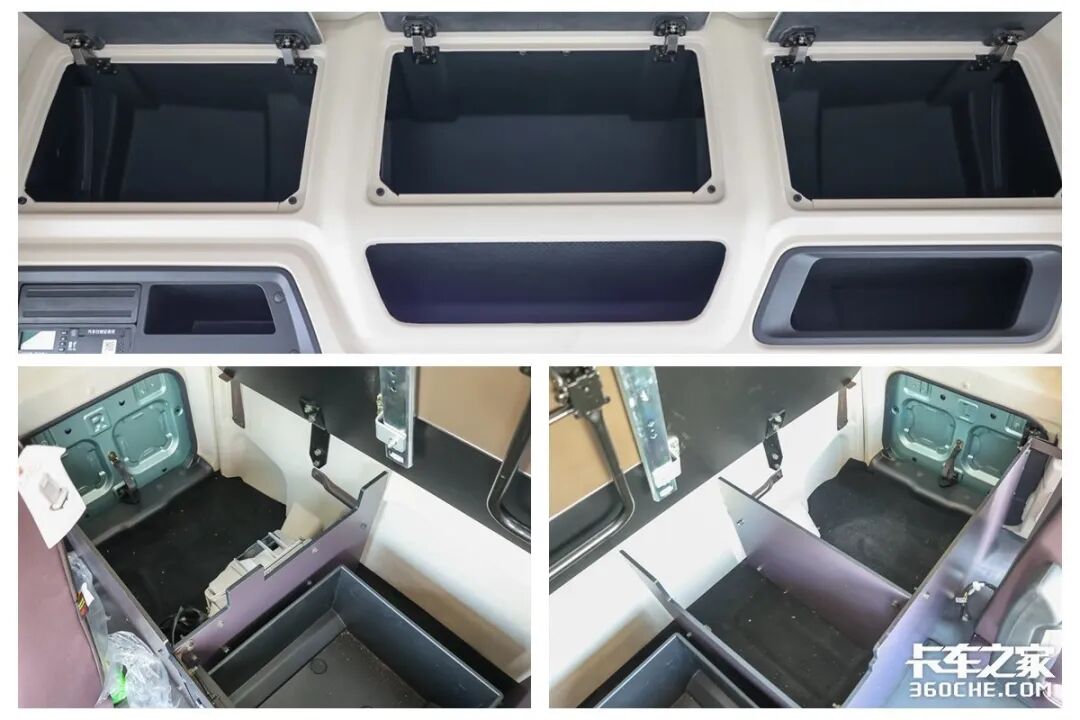 还有一个非常实用的升级就是储物空间,操作台上方布置有三个尺寸较大的储物箱以及三个较小的储物格,卧铺下还有三个储物格和抽屉式储物箱,能够更好地将随车物品分类放置,再也不怕长途出车时东西没地儿放了。