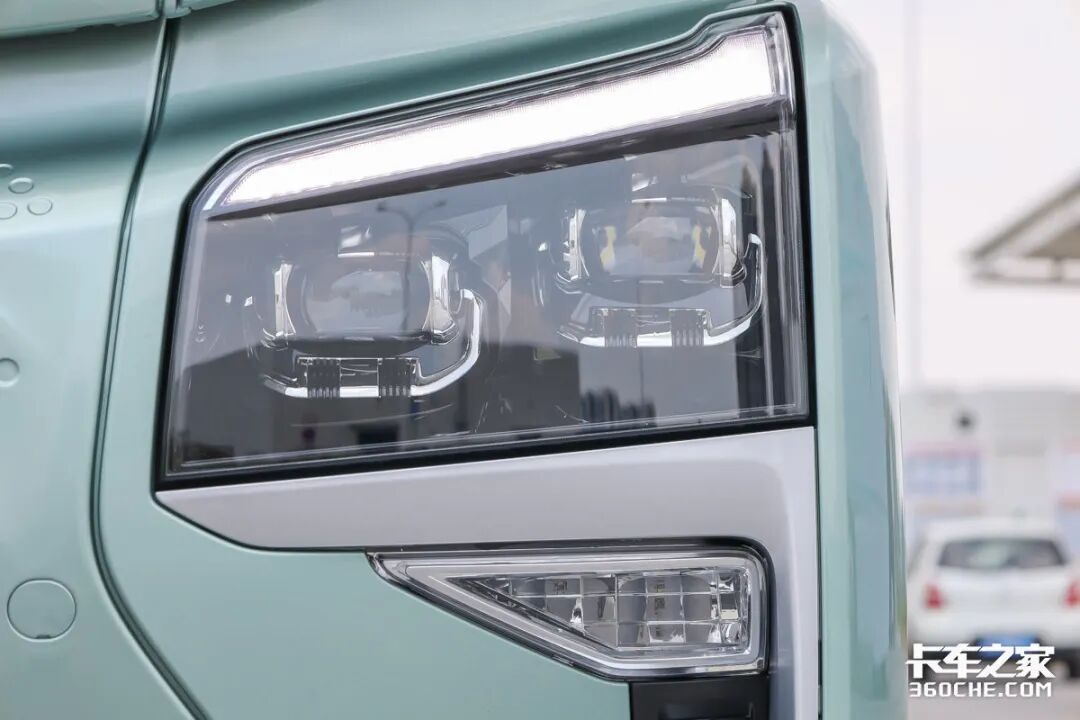 大灯灯组的配备了全LED光源,远近光灯皆为矩阵式透镜结构,不但照明亮度高,还能进一步延长使用寿命。上方如同眉毛般的日行灯非常“神气十足”,但同时它还集成了目前重卡车型上比较少见的流水式转向灯,视觉效果一流。