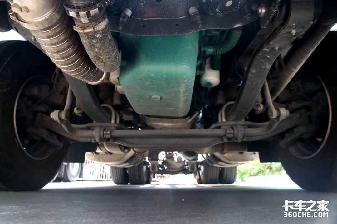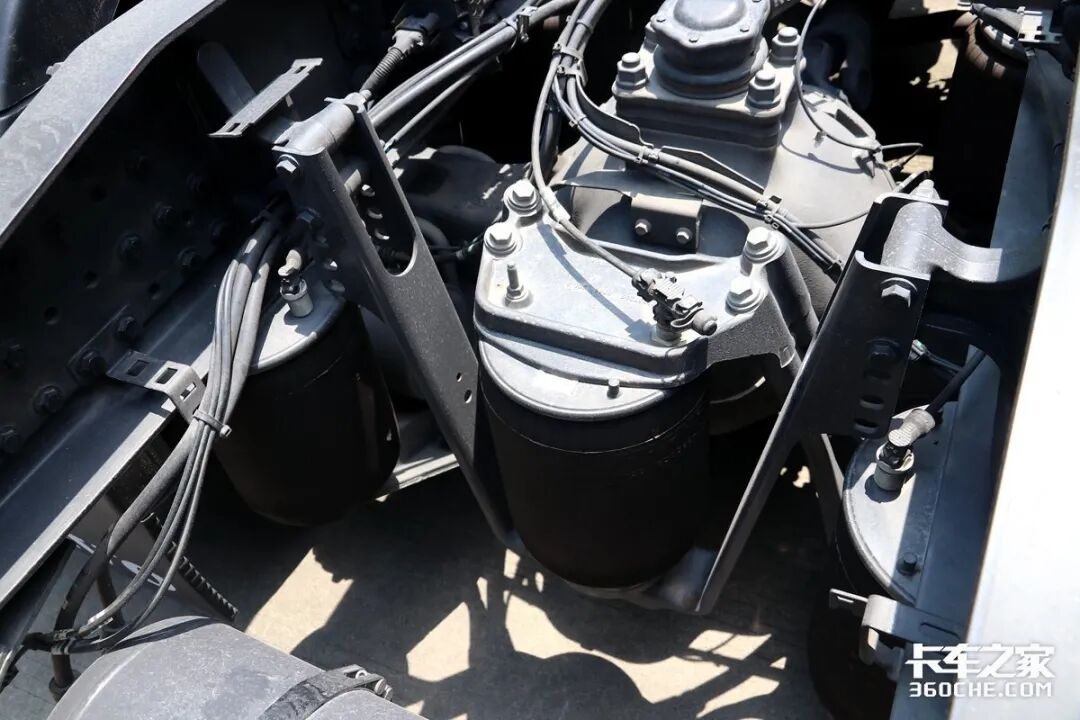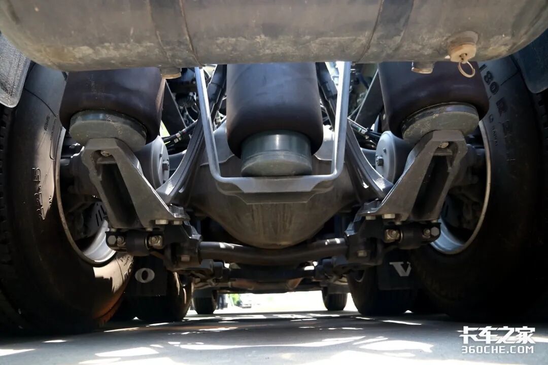 省钱的第二步就是要针对使用场景选对车,实拍FH车型在底盘部分很有意思,这是一台6X4并带有后桥提升功能的车型。整个底盘布局了九个气囊,除了一个气囊用于提升后桥外,其余八个气囊均为减震结构。首先气囊减震不仅能让车辆在高速巡航时更加稳定,同时在应对高时效性的甩挂运输而言也能实现更快参与甩挂,减少时间成本。