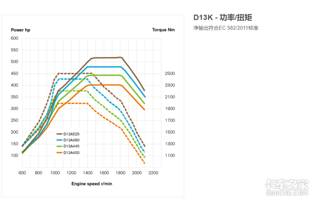 另一款是采用了D13K500发动机,和460同属D13K发动机系列,不过其最大功率调教至368kw(500马力),最大扭矩2500牛米。在980-1270rpm区间内可以输出最大扭矩。不论是460还是500的发动机,在1000rpm以下就可以进入最大扭矩输出区间,最大扭矩介入早意味着车辆能以更低的转速进入最佳工况,同时转速低了也就意味着油耗下降。