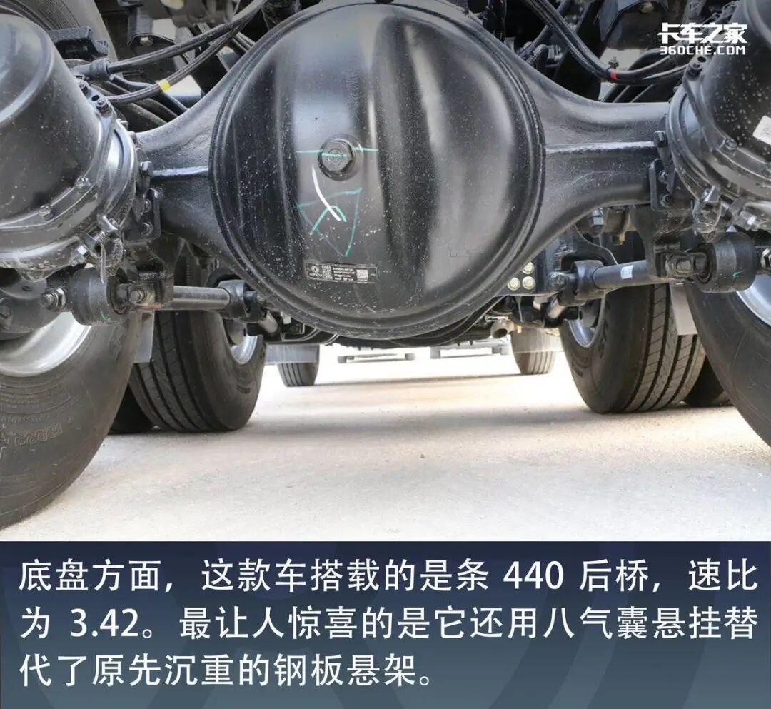 底盘方面,这款车搭载的是条440后桥,速比为3.42。最让人惊喜的是它还用八气囊悬挂替代了原先沉重的钢板悬架,不仅可以降低车辆重量,而且还能有效提升车辆的稳定性,货损率低,非常适合运载高附加值货物。