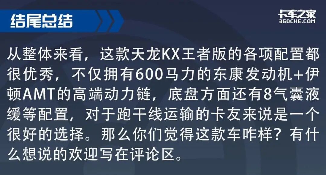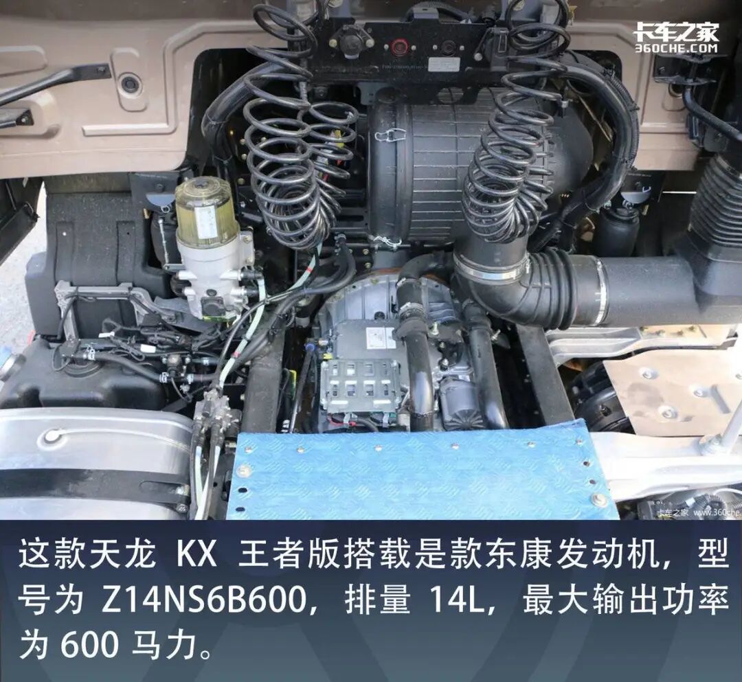 【卡车之家 原创】搭载600马力东康发动机,装配伊顿12挡AMT还有8气囊悬挂,看到这配置相信大家对这款车已经有些期待了吧。没错,它就是东风天龙KX王者版。