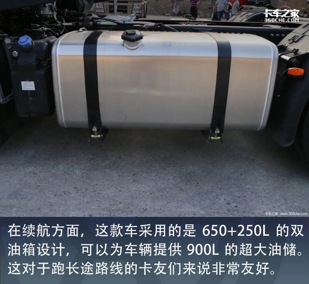 在续航方面,这款车采用的是650+250L的双油箱设计,可以为车辆提供900L的超大油储。这对于跑长途路线的卡友们来说非常友好。如果这都满足不了你,还可以选择850L+300L的方案。