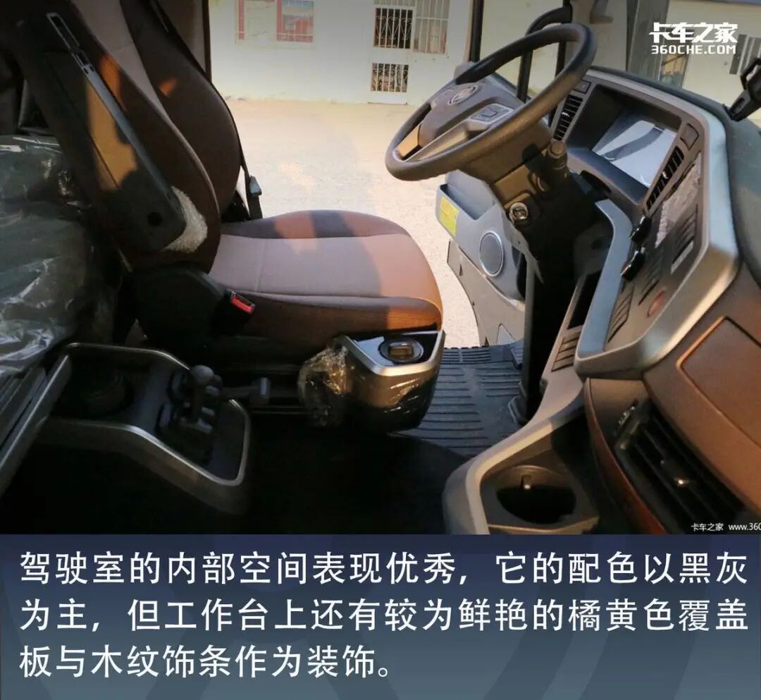 驾驶室的内部空间表现优秀,它的配色以黑灰为主,但工作台上还有较为鲜艳的橘黄色覆盖板与木纹饰条作为装饰。