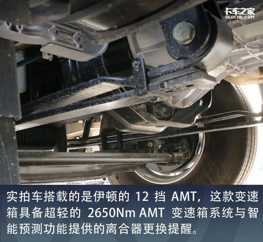 在传动系统方面,实拍车搭载的是伊顿的12挡AMT,这款变速箱具备超轻的2650Nm AMT变速箱系统与智能预测功能提供的离合器更换提醒,操作便利、换挡轻便轻松,而且还有超长的换油里程,提高车辆的出勤率。