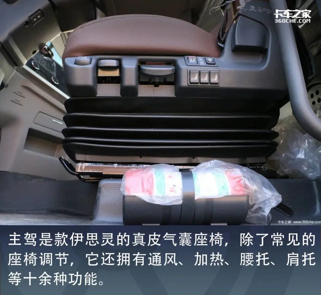 主驾是款伊思灵的真皮气囊座椅,除了常见的座椅调节,它还拥有通风、加热、腰托、肩托等十余种功能,而且搭配上140mm全气囊驾驶室悬置,能够有效过滤路途中的颠簸。