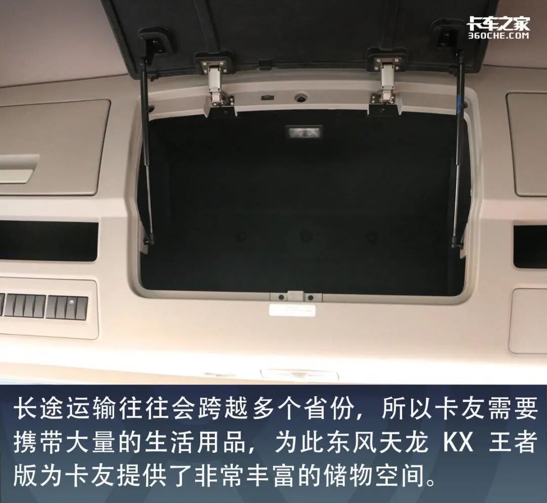长途运输往往会跨越多个省份,气候环境会有较大的差别,所以卡友需要携带大量的生活用品,为此东风天龙KX王者版为卡友提供了非常丰富的储物空间。