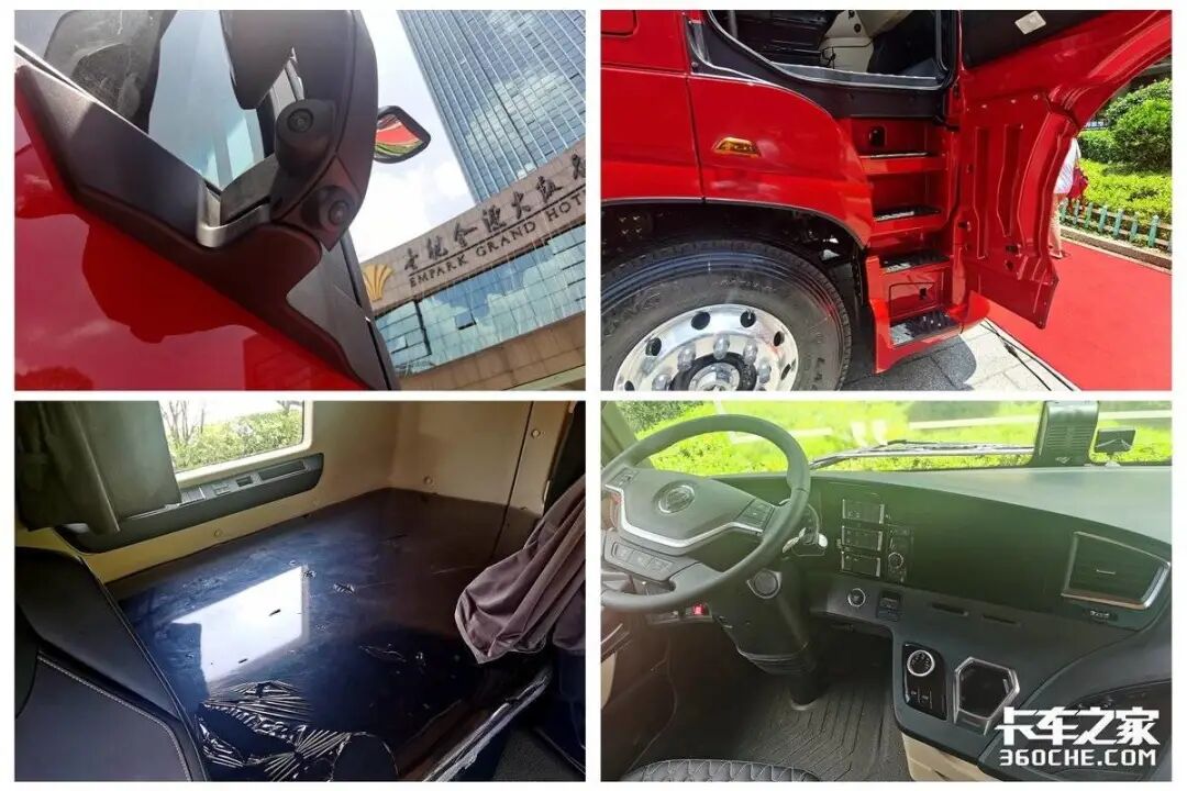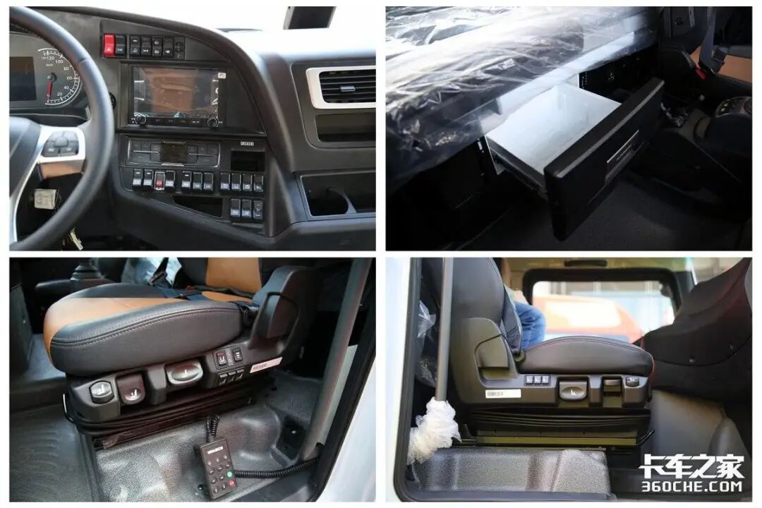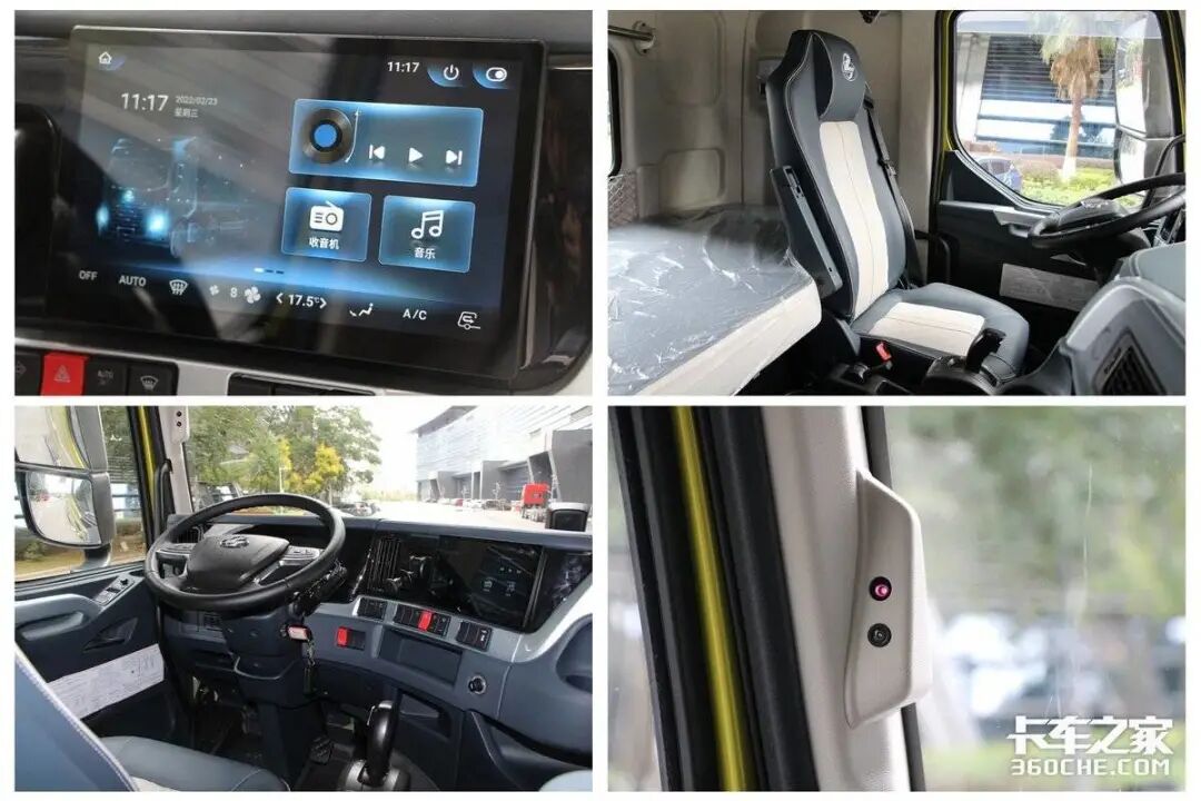 进入到驾驶室内部,虽然商务舱相比头等舱以及生活舱配置更简单,但在同级别重卡中表现也相当不错,平地板驾驶室,主驾驶采用的是伊思灵气囊减震座椅,全液晶仪表盘、中控大屏、电动调节电加热后视镜、多功能方向盘等都是标配。当然如果大家想要更舒适的驾乘环境,也可以考虑同动力链搭配的生活舱或者头等舱车型。