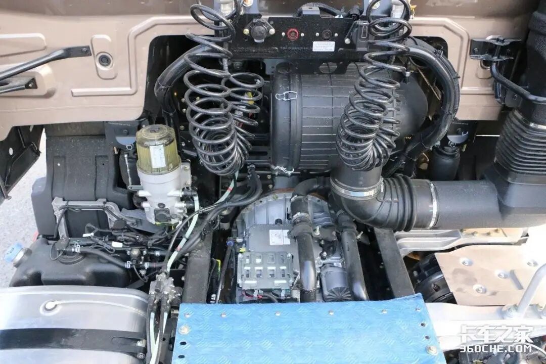 传动系统方面,这款车搭载的是采埃孚传胜12挡AMT变速箱,型号为12TX3221TO,后桥则采用的是440后桥,后桥速比为2.733,保养周期长达10万公里,悬架采用的是前2后3少片簧设计。